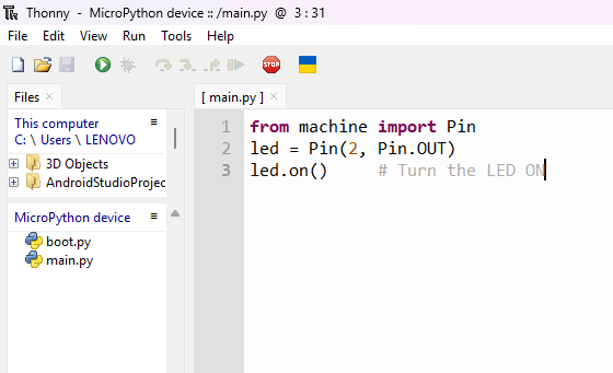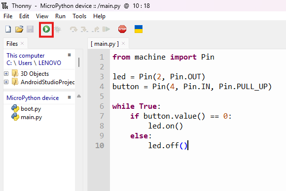 main.pyinstead of another filename. - Wrong GPIO pin used — Match the pin number in the code with the actual ESP32 pin connection.